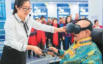 重陽節(jié)前后,內(nèi)蒙古呼和浩特市玉泉區(qū)邀請(qǐng)轄區(qū)老年人走進(jìn)該區(qū)新投入運(yùn)營的大數(shù)據(jù)應(yīng)用產(chǎn)業(yè)基地,近距離感受新科技帶來的生活和工作方式的變化。下圖為一位老人在體驗(yàn)VR眼鏡。